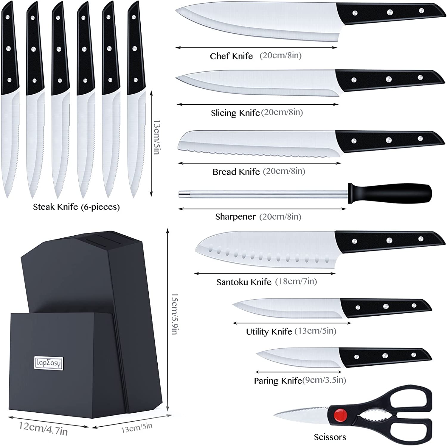 LapEasy 15-pieces Knife Set with Block is an all-in-one solution for kitchen cutting tasks. This set features blades made of high carbon German stainless steel designed for professional and home use. Ergonomic handles allow for maximum comfort and precision. This set includes: a 8 chef knife. 8 slicing knife. 8 bread knife. 7 Santoku knife. 5 utility knife. 3.5 paring knife. 6 steak knives. an all-purpose scissors. and an 8 sharpener. all conveniently stored in the included pine wood block. To maintain this set. keep it away from humid environments and corrosive materials. ensure it's clean and dry. and oil the knife regularly.